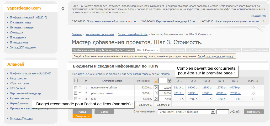A la fin, il sortira le pronostic du budget et du traffic pour chaque mot-clé, étudiera tous vos concurrents et proposera ainsi la meilleure strategie de l’achat de liens. Alors, il ne vous reste qu’ à charger des fonds et s’attendre à un miracle!:)